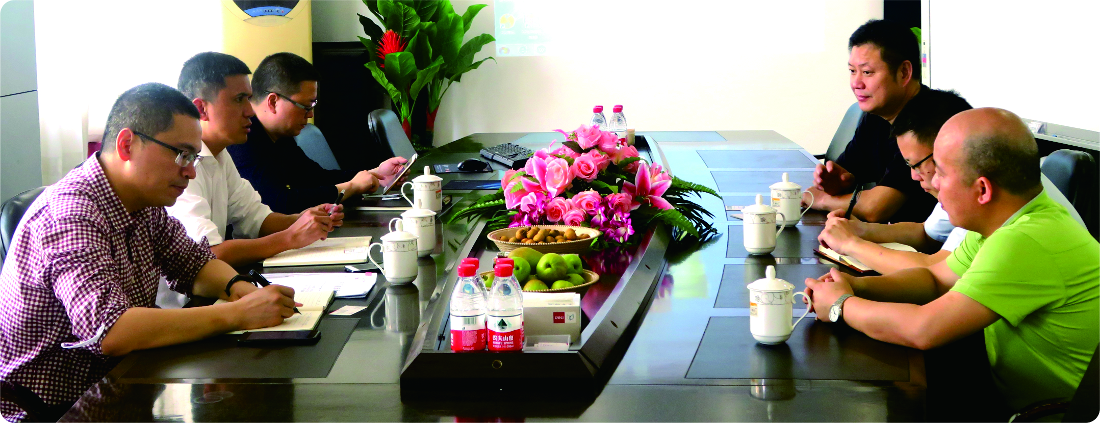 陈庆东等人在仔细聆听了董事长关于企业发展历程,公司目前的生产经营情况、新产品研发进度及人才引进情况,公司的稳步发展给他们留下了深刻印象。同时,宾主双方就政企双方合作进行技术人员技能提升培训等方面进行了深入交流,通过政府相关部门牵头整合企业高级人才、高校教师等师资力量和协调场地,企业派出技术人员学习,用社会力量提升企业产品研发水平,给员工更多的实战经验积累的机会和职称认定的空间。